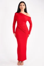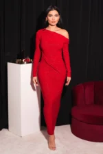 The ‘Mayra‘ dress is a stunning long dress made from glittery fabric, perfect for making a statement. It features a daring side slit that highlights the leg, adding a bold element. The design includes long sleeves and a unique side opening on the chest, combining elegance with a modern edge.