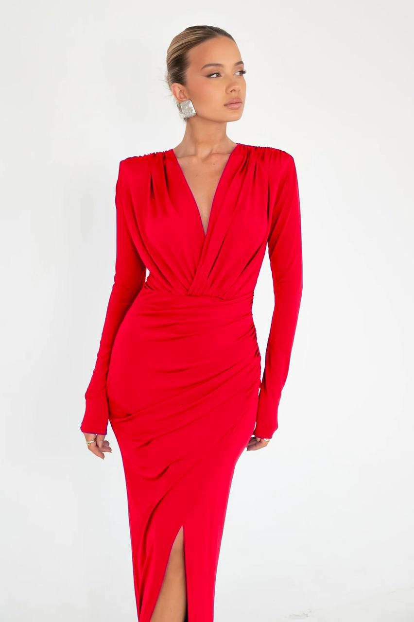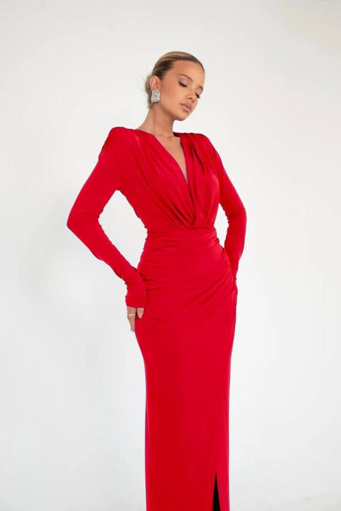 The ‘Niyah‘ dress is a long, elegant gown with a form-fitting silhouette, made from a smooth and stretchy fabric. The dress features long sleeves and a deep V-neckline that extends to the waistline, creating a gathered look at the bust. The skirt has a high slit on one side, providing a glimpse of the leg and adding a sultry touch to the sophisticated design. The overall look is classy and sleek, suitable for formal or special occasions.