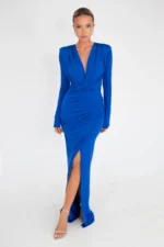 The ‘Niyah‘ dress is a long, elegant gown with a form-fitting silhouette, made from a smooth and stretchy fabric. The dress features long sleeves and a deep V-neckline that extends to the waistline, creating a gathered look at the bust. The skirt has a high slit on one side, providing a glimpse of the leg and adding a sultry touch to the sophisticated design. The overall look is classy and sleek, suitable for formal or special occasions.