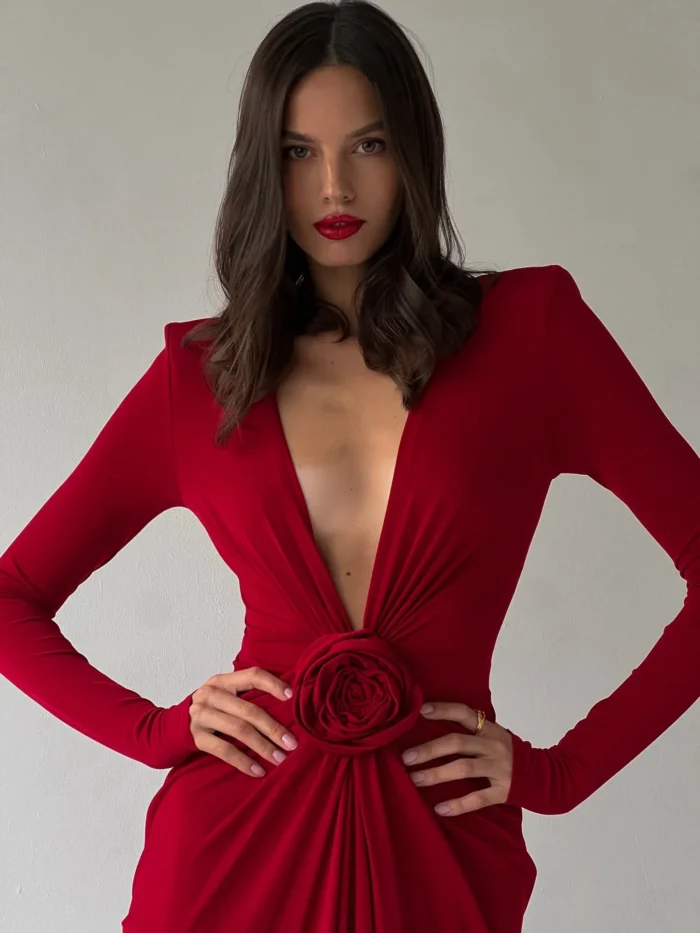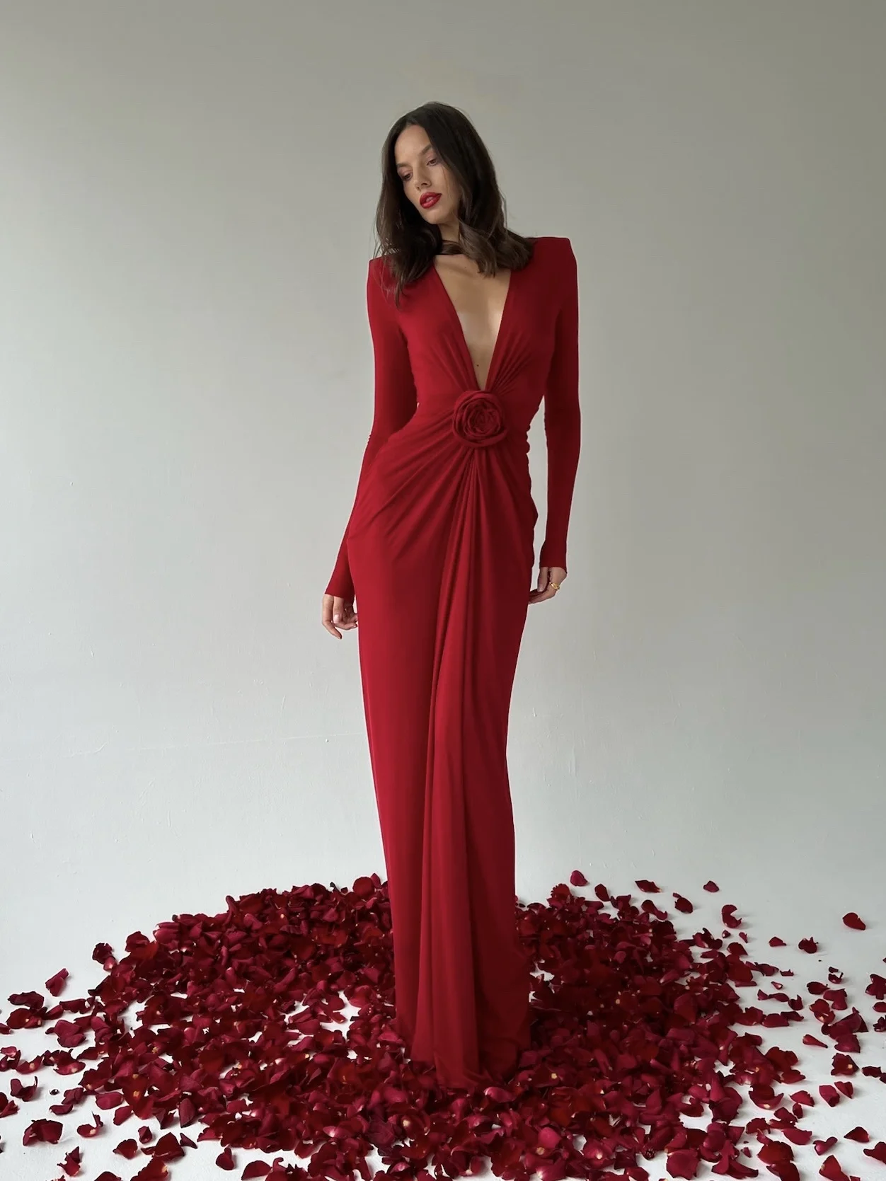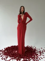 Tanaya Dress draws attention with a deep neckline , bringing a romantic and bold touch ,It fits closely, tracing the body’s curves. Central vertical ruching creates draped texture that slims the waist. The gown is maxi length, reaching the ankles, perfect for sophisticated evenings or summer weddings. Its stretchy, shiny fabric catches the light while keeping you comfortable. Style it with sleek high-heeled sandals and accessories.